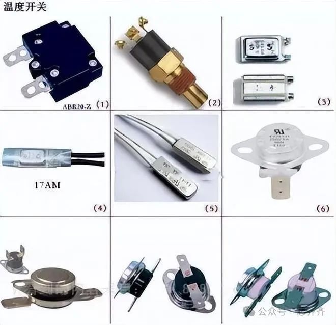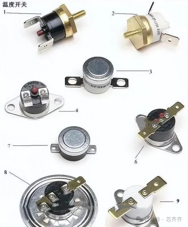 温度开关是一种用双金属片作为感温元件的温度开关,电器正常工作时,双金属片处于自由状态,触点处于闭合/断开状态,当温度升高至动作温度值时,双金属元件受热产生内应力而迅速动作,打开/闭合触点,切断/接通电路,从而起到热保护作用。